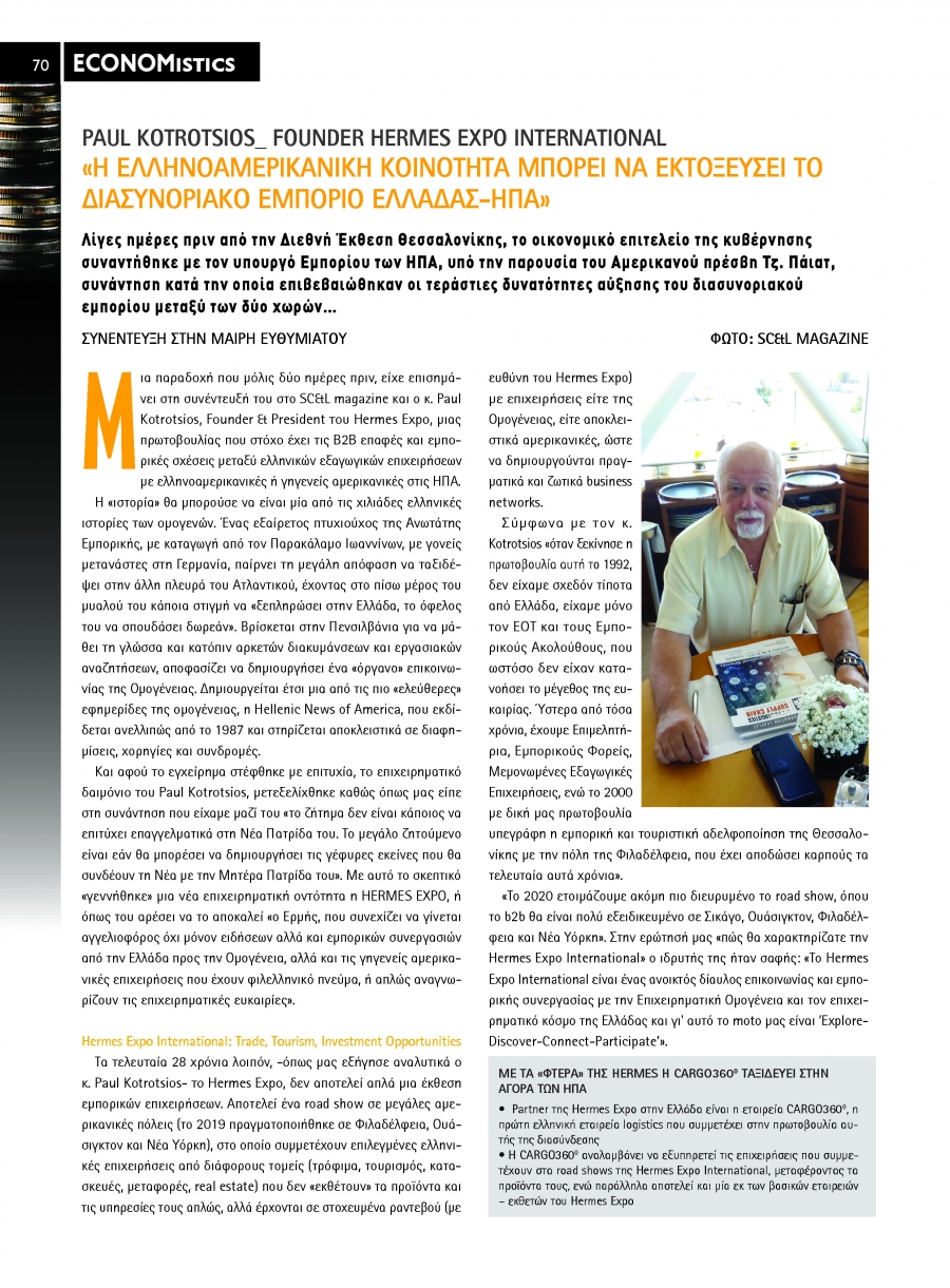 Τα τελευταία 28 χρόνια το Hermes Expo International διενεργείται κάθε χρόνο σε διάφορες πόλεις των ΗΠΑ, υπό την διοργάνωση του Paul Kotrotsios και την υποστήριξη της επιχειρηματικής ελληνικής ομογένειας. Αποτελεί ένα road show σε μεγάλες αμερικανικές πόλεις (το 2019 πραγματοποιήθηκε σε Φιλαδέλφεια, Ουάσιγκτον και Νέα Υόρκη), στο οποίο συμμετέχουν επιλεγμένες ελληνικές επιχειρήσεις από διάφορους τομείς (τρόφιμα, τουρισμός, κατασκευές, μεταφορές, real estate) που δεν «εκθέτουν» τα προϊόντα και τις υπηρεσίες τους απλώς, αλλά έρχονται σε στοχευμένα ραντεβού (με ευθύνη του Hermes Expo) με επιχειρήσεις είτε της Ομογένειας, είτε αποκλειστικά Αμερικανικές, ώστε να δημιουργούνται πραγματικά και ζωτικά business networks.