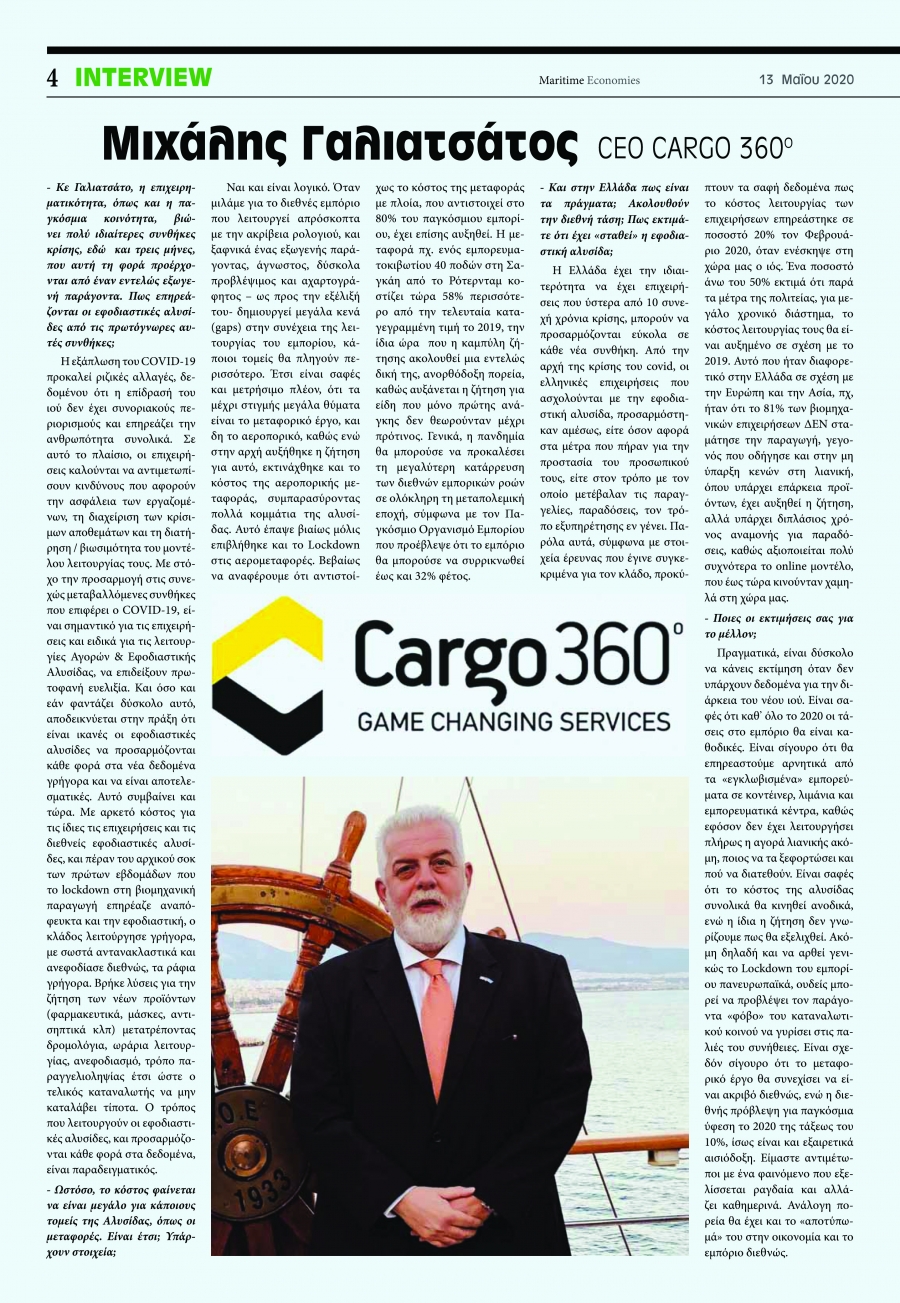 Μια πολύ ενδιαφέρουσα συνέντευξη, αναφορικά με την ιδιότυπη περίοδο που βιώνουν οι επιχειρήσεις και το διεθνές εμπόριο λόγω των επιπτώσεων του covid-19, παραχώρησε στο Maritime Economies, ο επικεφαλής της Cargo3600 κ. Μιχάλης Γαλιατσάτος, αναφερόμενος στον τρόπο αντίδρασης της εφοδιαστικής αλυσίδας, το μεταφορικό κόστος και πως εξελίσσεται σε διεθνή δρομολόγια, ενώ ερωτήθηκε και για την λειτουργία της εσωτερικής αγοράς.